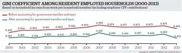 当然,在税收低的另一面,可能会被人诟病的就是新加坡的贫富差距。纵观过去十几年,新加坡的贫富差距一直处于世界上比较高的水平,和美国类似,在亚洲就比香港好一点。在最近两年,政府每年的预算中都有提到对于最低收入阶层的扶持,但是新加坡政府不想走上欧洲福利社会(高税收,高政府福利)的道路,因此如何有效的在不影响生产力的前提下减少贫富差距是政府面临的最棘手的问题之一。