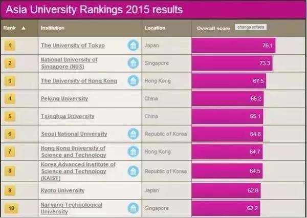 由于对于教育的巨大投入,新加坡的两所历史比较长的大学,新加坡国立大学和南洋理工大学,在亚洲都属于顶尖水平。比如以上Times在2015年的亚洲大学排名中,国立大学位列亚洲第二,南洋理工位列亚洲第十。
