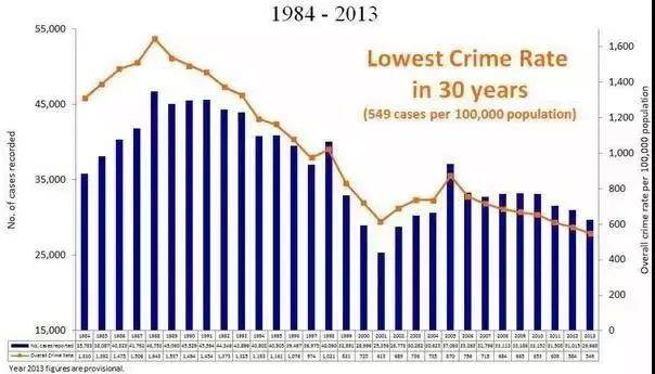 在过去30年,根据政府公布的数据,新加坡的犯罪率逐年下降: