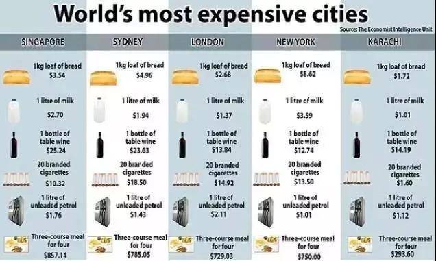 2015年,新加坡被经济学家杂志评为世界上生活成本最贵的城市。在上图中你可以看到,新加坡的面包和牛奶价格比伦敦还要贵,烟酒被政府课以重税,汽油价格比纽约更贵,而去饭店就餐的价格全世界最高。