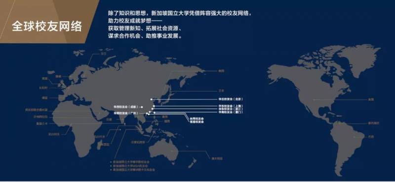 新加坡国立大学拥有近300,000名强大校友网络,并以每年约10,000名的速度递增,其中,商学院46,000余名精英校友遍布全球,并以每年约900名的速度递增。新加坡国立大学EMBA校友在中国甚至国际上各行各业独领风骚。