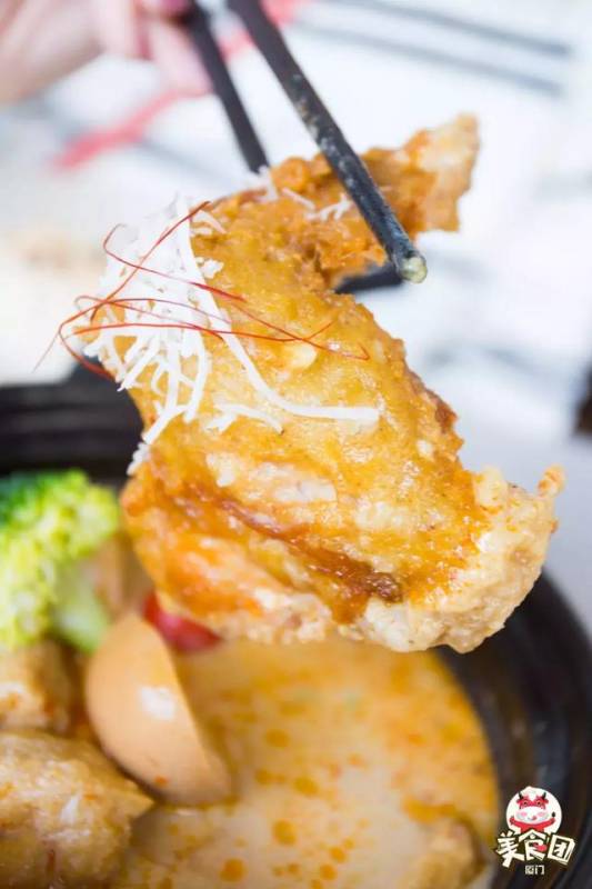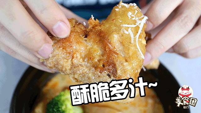 超大的炸鸡翅十分抢眼。表皮炸得金黄酥脆,内里的嫩肉多汁喷香,吸饱汤汁更是独具韵味,光看着就令人食指大动。