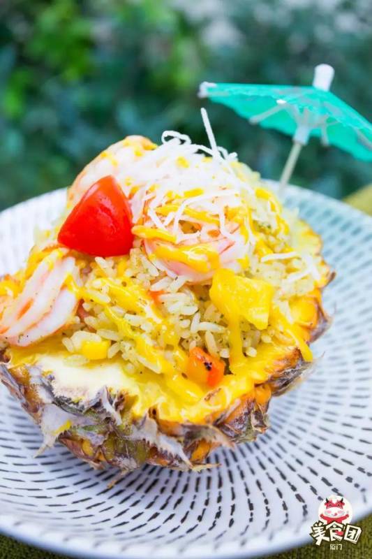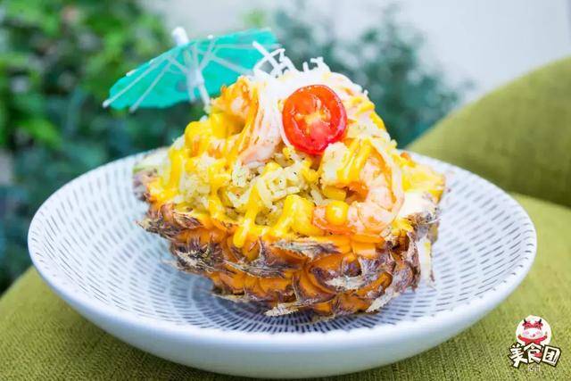 完整的半颗菠萝壳做碗,菠萝果肉与鲜虾、玉米等配料和米饭一同翻炒,菠萝微微酸甜的味道十分开胃,美味又吸睛。