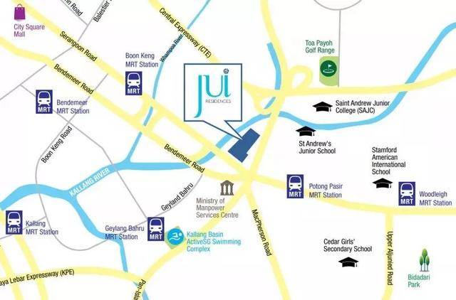 JUI Residences位于新加坡第12区的实龙岗路上段(Upper Serangoon Road),属于新加坡的东北区,是市区边缘地区,公寓的西侧面对的是加冷河,可以看到优美的河滨风光,商业活动在加冷河一带迅速增加,给该项目和周边项目带来了更多转售商机,加冷河会修建一个连通新加坡核心休闲区的跑道和健身场所,便于附近的居民健身和放松心情。