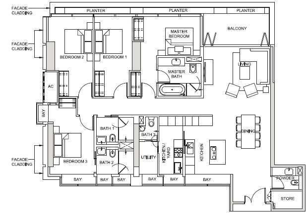 三卧室户型,套内面积149平方米起(1604平方尺)