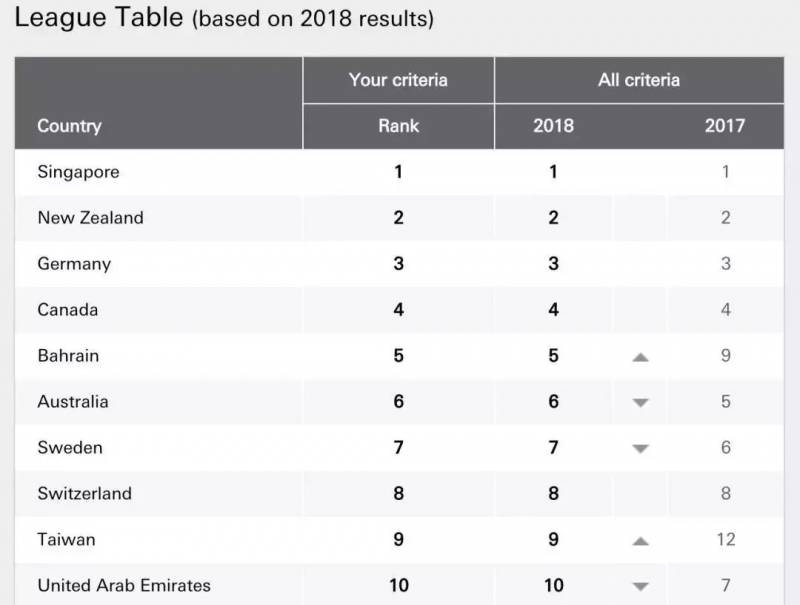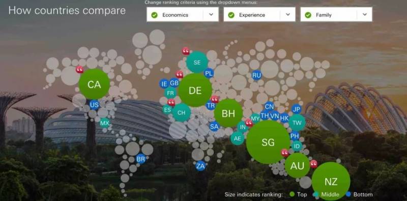 在今年的整体排名中,新加坡高居第一成为全球最佳居住和工作地点,这也是新加坡连续四年成为冠军,德国、新西兰、加拿大、巴林位居前五,澳大利亚排名第六,瑞典排名第七位,瑞士仅排在第八位,抚养孩子的高成本和交朋友的困难使它与之背道而驰。
