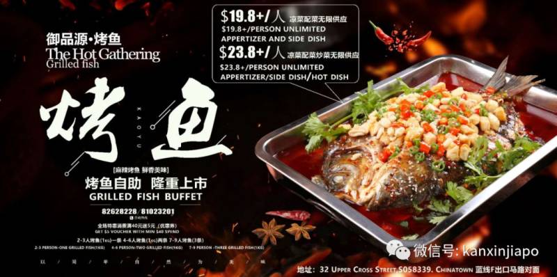 这家叫做“御品源·干锅烤鱼”的店位于32 Upper Cross Street ,牛车水地铁站F出口马路对面,邮编S058339。电话咨询:82628228/81023201