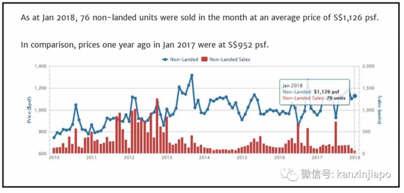 2010年才S$700多/尺;2017年1月需S$952/尺;2018年1月,当月卖出76套非有地住宅,平均售价S$1126/尺。
