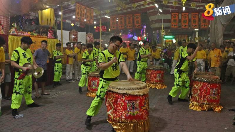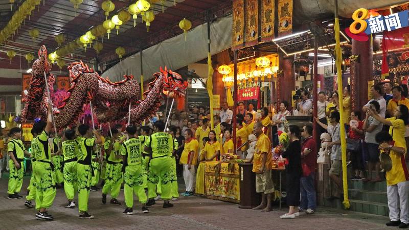 恭送九皇大帝圣驾仪式晚上7点正式开始,在响亮的敲锣打鼓声中,由舞龙舞狮掀开接驾仪式。除了精彩的锣鼓表演,庙内的酬神仪式也包括十二生肖神将表演,现场热闹非凡。