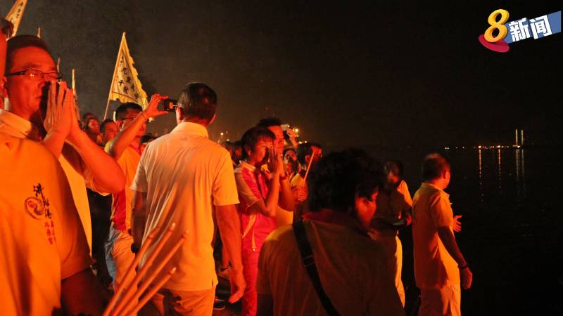 不少信众手拿着香,一家大小站在海岸上祈福,目送神舟出海,场面壮观。恭送九皇大帝圣驾回銮仪式于9点30分左右,在一片“兴、旺、发”及锣鼓声中结束。
