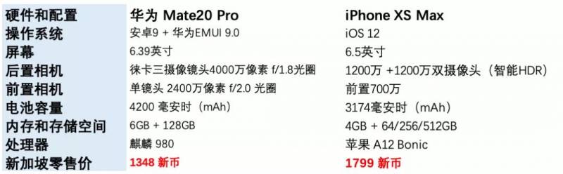 我们先来看看华为Mate 20和新iPhone的性能参数对比。