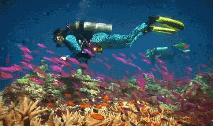 潜水时,把自己当作一条鱼,和色彩斑斓的鱼群一起,自由自在地穿梭在奇形怪状的珊瑚群里!