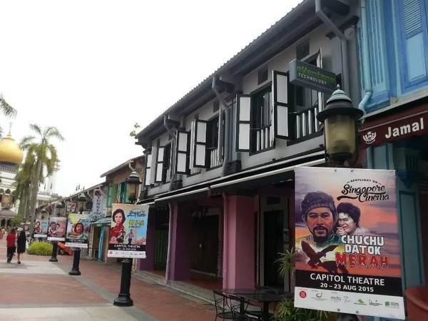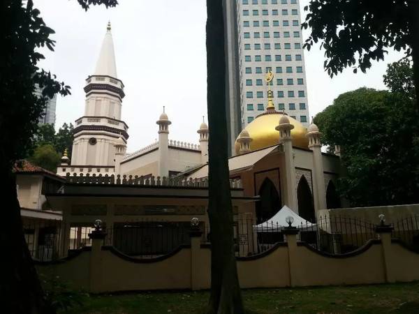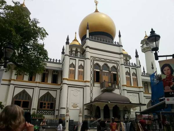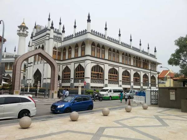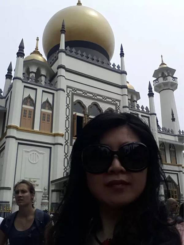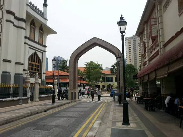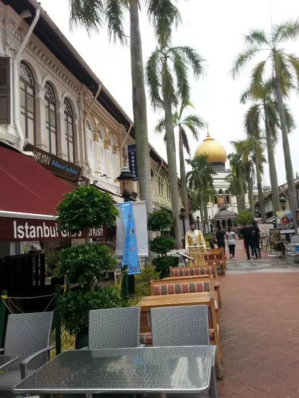 马拉巴清真寺在地铁的另一边,想来清真寺都大同小异,万一进不去我不是“英雄白跑路”么?于是,“马拉巴”就被我果断地忽略了。嘿嘿!坐地铁前往苏丹清真寺和马来王宫!武吉士站下车,马上通过就近的公交地图寻找目的地,再一路打听,很近耶!在哈芝巷(我是回程时才发现这就是哈芝巷,还到处问都没问到)口,过红绿灯时我向一个姐姐模样的打听苏丹清真寺或者马来王宫,她告诉我前面不远处有一个王宫,没听说有什么清真寺,然后叫我跟她走。路上得知她来自中国苏州,苏杭美女耶!怎么看起来一点都不仙,皮肤象本地人了,黑黑的,头发也没打理,清汤挂面在后脑勺随意一扎,像个小尾巴。她有三个孩子,都在苏州老家,她来这边五年了,挣钱(看来钱比亲情和孩子都重要)。我问她为什么不把孩子带到身边,在这边来上学。她说:“我才不想孩子来这里上学呢,这边的人笨得很,你明明就在算计他他就不知道,孩子要是过来了,以后也会变笨的,回去不适应中国的社会。”我的道德标准不知道如何来衡量新加坡人的“笨”和中国人的“聪明”了,我不得不承认这个国家的公民在严格的制度化标准化管理下变得有点死板,但我也不得不承认人家应该是建立在一种信任基础上的真实不狡诈!马来王宫路口很快到了,我一拐进去,看到的却的苏丹清真寺,真是漂亮极了!大爱!
