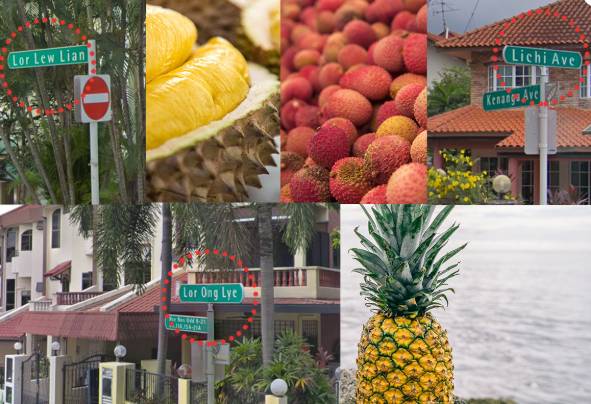Lorong Lew Lian(罗弄榴梿)位于实龙岗一代,而Lorong Ong Lye(罗弄黄梨)就在它的后面。Lichi Avenue(荔枝道)则是在麦波申一带。虽然不知道叫这些名字的具体原因,但相信是因为新加坡榴梿荔枝黄梨一类的热带水果非常多,才在早期如此命名。