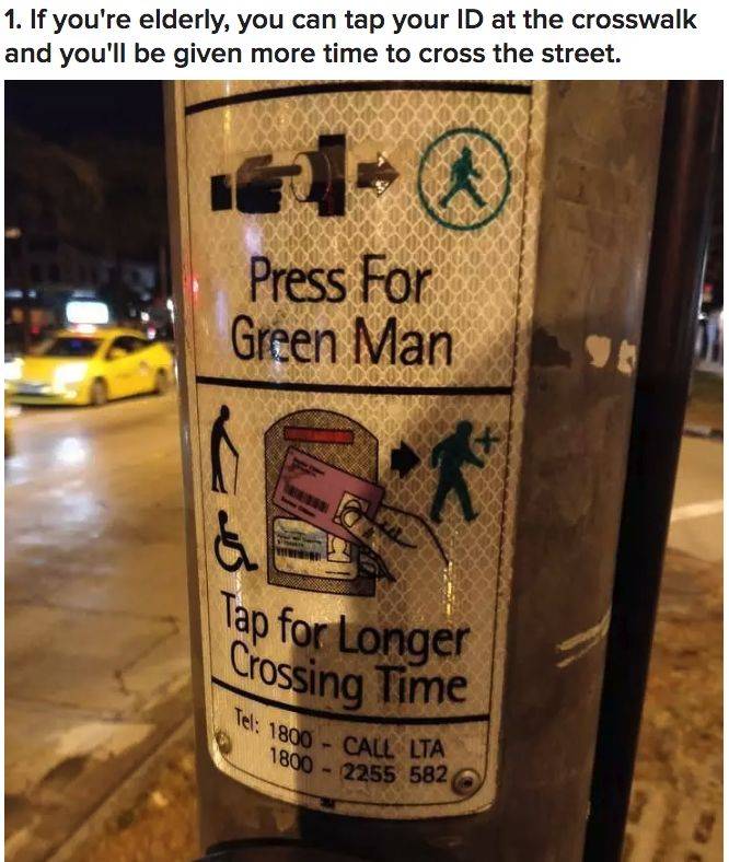 在新加坡,老人过马路时可以在交通灯打卡,这样就可以有更多的时间过马路。