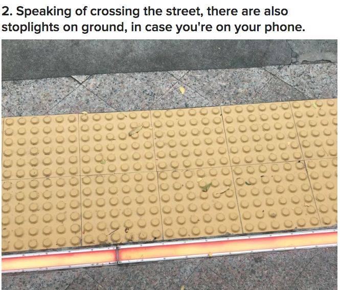 马路边的地上还有红绿灯,就算忙着低头看手机,也不用担心会错过绿灯。