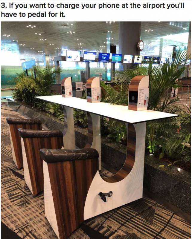 手机需要充电的话,樟宜机场有个“脚踏车式”充电站,一边充电,一边还运动了,一举两得。