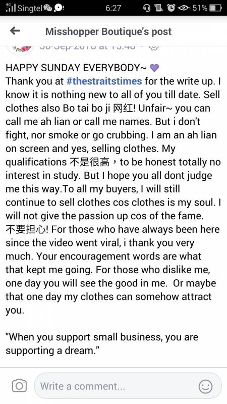 翻译:感谢《海峡时报》的文章。我知道最近大家都对我很关注。卖衣服居然能成网红?不公平!你可以叫我阿莲或叫我名字。但我不打架,也不抽烟或发脾气。我在镜头前的确是阿莲,也的确是卖衣服的。我的学历不高,实话说,对学习完全没兴趣。但我希望你们不要以此来给我贴标签。