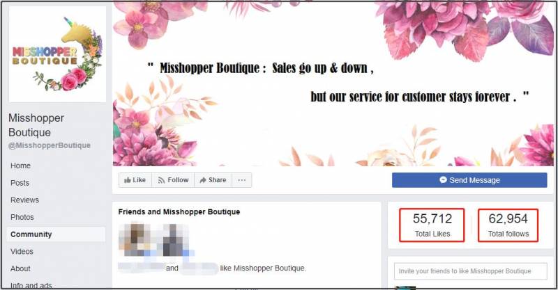 她的个人网店的Facebook页面,已经有6万多关注者,和5万多点赞数。
