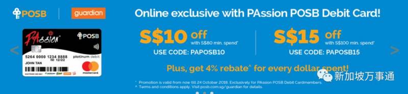 只要你有PAssion POSB Debit 卡,在Guardian消费满80新元就有10新元折扣,折扣码:PAPOSB10。满100新元就有15新元的折扣,折扣码:PAPOSB15。