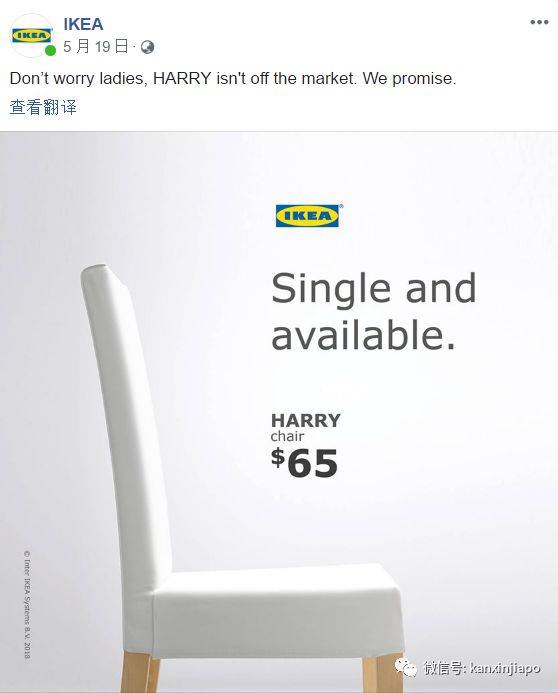 今年5月,英国哈里王子大婚,全球亿万少女的梦碎了。宜家趁机推出了它的HARRY椅子,并说:“女士们不要担心,我们保证,HARRY并没有下架。”图片里面则写着“单卖(也可以理解为单身)且供挑选”的标语。不知道有没有心碎的少女去宜家领一个回家……