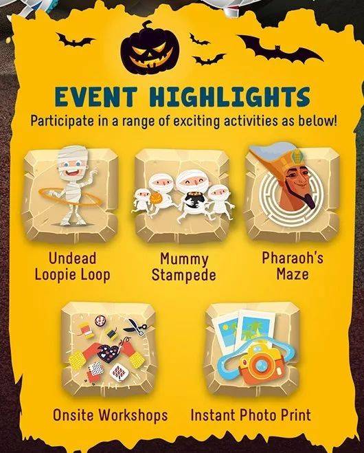 活动主题为“木乃伊来袭”。每人可以玩3个游戏,参加1节现场绘画课,收到1张打印照片和1份大礼包。当日派对上还会举行最佳装扮评比,获奖者有丰厚奖品。
