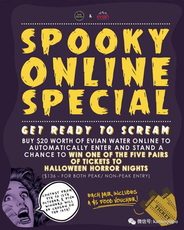 在网上购买价值$20的依云产品,有机会赢得两张万圣节惊悚夜的门票(价值$136,共十张)和一个价值$5的免费食物券。