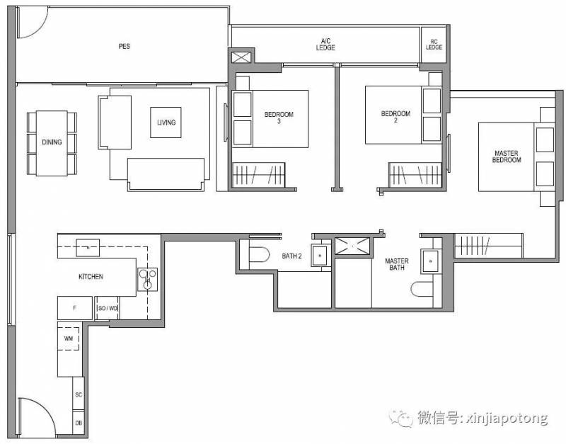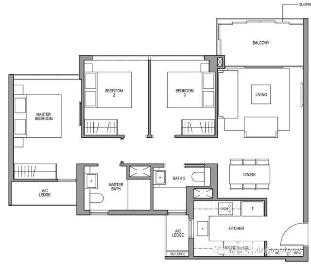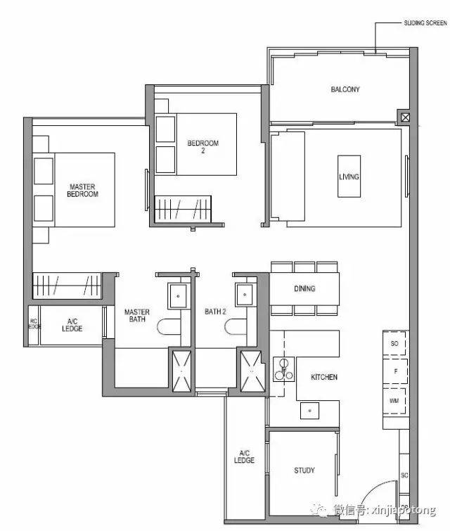 2卧室+书房户型,81平方米,每个房间可放双人床,喜欢烹饪的朋友最爱的封闭式厨房,户型方正,连书房可以挺容易放下单人床,价格236万新币起
