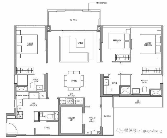 4卧室豪华型D1, 161平方米/1733平方英尺,自带私人电梯直接入户,舒适的主卧卫生间带浴缸,厨房为干,湿两部分,3个房间在右侧,另外一个小主人房在房子的左侧(自带浴室),如果碰上有亲戚朋友过来玩,可以灵活安排小主人房当客房用哦.价格为462.4万新币起