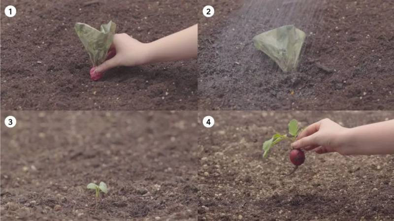 将蔬菜包直接埋在土里,在上面浇水使包装纸溶解。接下来只需等待种下的Vegeloop发芽长大,长出的竟然是完美无瑕的蔬菜!