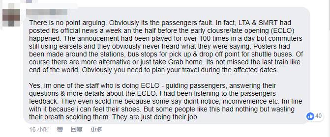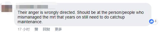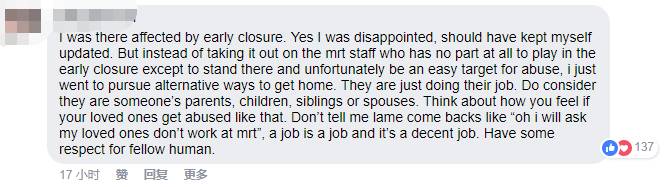 五毛翻译:我也被提早关闭影响到了。是的,我很失望,应该早点通知我。但是与其把怒气发泄在无辜的工作人员身上,我直接去找其他的交通方式了。工作人员站在那里很容易成为攻击目标,他们不过是在做自己的工作而已。想想他们也是别人的父母,孩子,兄弟姐妹或者丈夫。如果你爱的人被人辱骂,你是什么感受。别告诉我你会说:哦,那我会让他不要在SMRT上班了。一份工作始终是一份工作,而且还算是体面的工作。对你的同胞多点尊重吧。