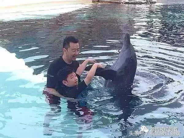 郭涛就曾携带儿子在水上探险乐园游玩,与海豚来了一次亲密接触: