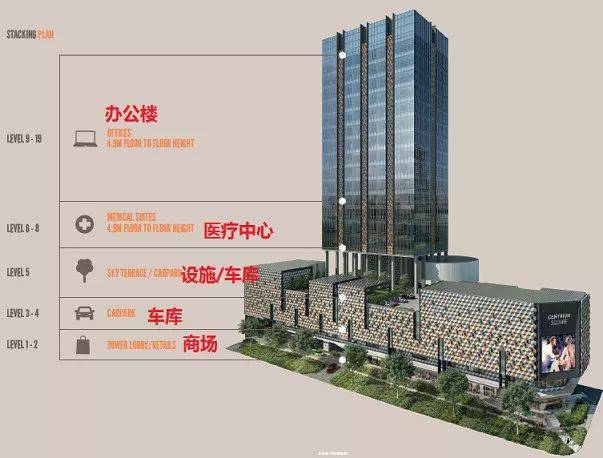 项目会建成一栋19层的高楼。其中一二层楼是商场,6-8楼是医疗中心,9-19层是143间办公楼。