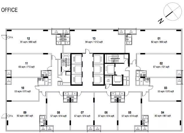 办公楼分布在9楼-19楼,总共143个单位,面积从53平米到94平米不等。