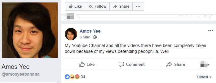 今年就有一位新加坡 YouTuber 余澎杉(Amos Yee)因为在YouTube 上支持恋童癖而被取消账号!