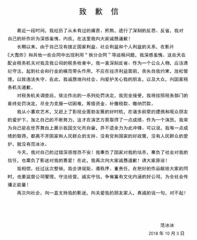 来来来,大家仔细品品,这封信反省得多么深刻!简直怀疑是税务局代笔(开玩笑)但范爷除了跟大家表达自己逃税的诚恳歉意,可能更多地是想说自己有多委屈!