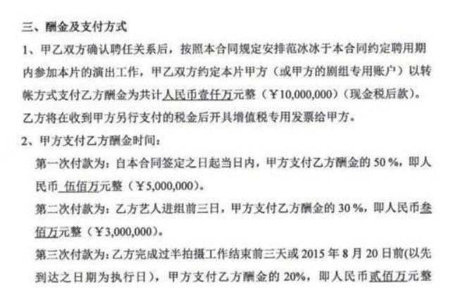 5月28日,他在微博上爆出合同照片,合同里还光明正大地出现了范冰冰的名字,这份合同约定片酬是税后1000万元人民币。