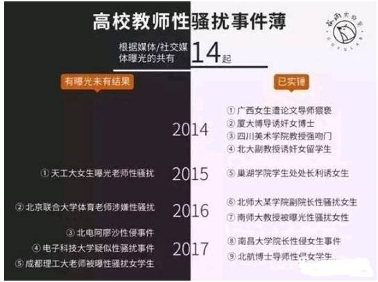 这是据不完全统计,2014年至2017年发生过的高校性侵事实或传闻: