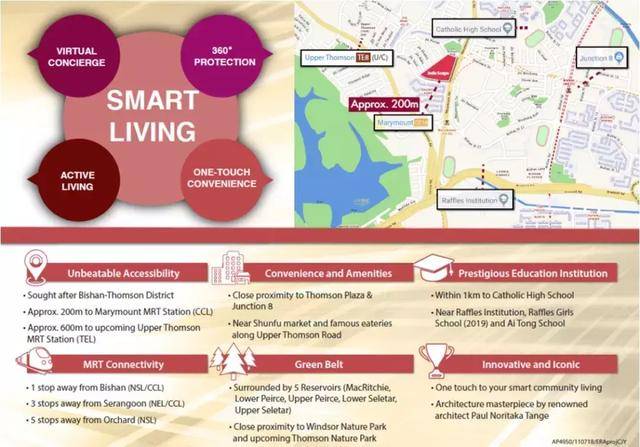 公寓距离环线地铁站玛丽蒙(Marymount)地铁站仅200米,2023年完工的Upper Thomson地铁站也在附近,8分钟步行即可抵达(650米)。
