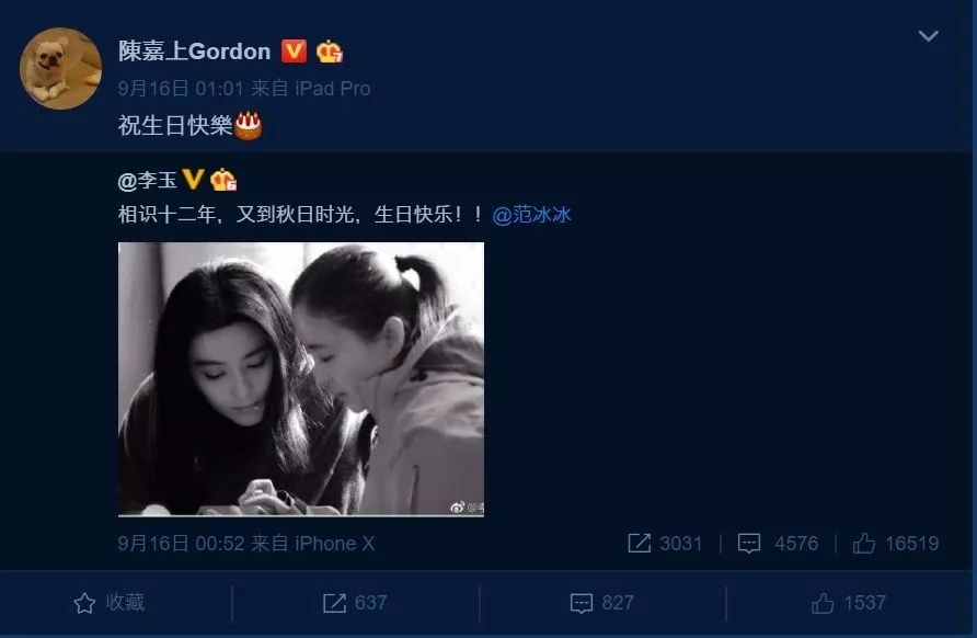 今年,范冰冰只收到了四个人的祝福,李玉,陈嘉上