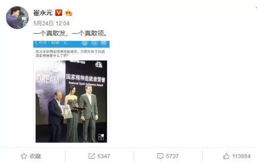 5月24日,崔永元微博发了八年前范冰冰领“国家精神造就者”奖的照片,配文是“一个真敢发,一个真敢领”。