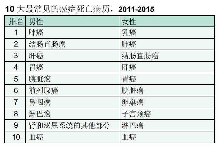 对于女性来说,致死率最高的癌症是乳癌,其次是肺癌和结肠直肠癌。