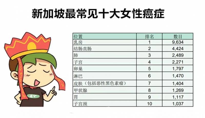 在新加坡女性中,癌症按照发病数从高到低排序,第一是乳癌,其次为结肠直肠癌和肺癌。