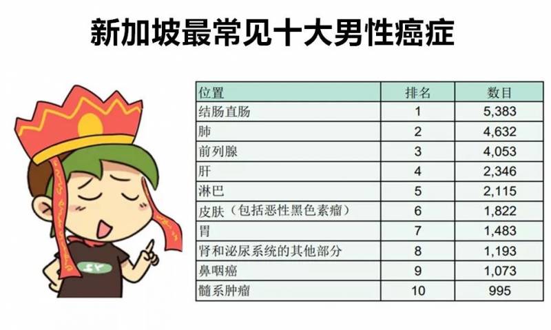 在新加坡,对于男性来说,致死率最高的癌症是肺癌,其次是结肠直肠癌和肝癌;