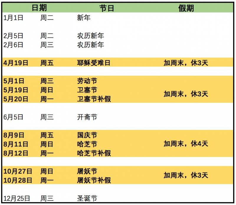 假期数虽然和往年一样多,但是紧邻双休日的假期多达5个,也就是说明年在新加坡工作的我们有4个小长假。其中有一个小长假竟然有4天!是不是想想就有点小开心?