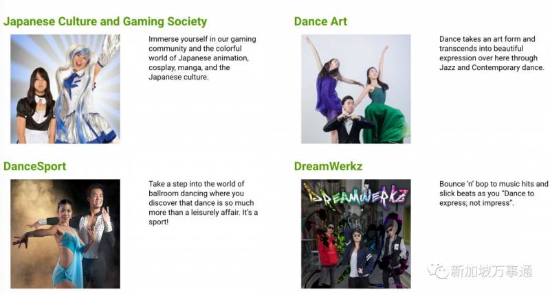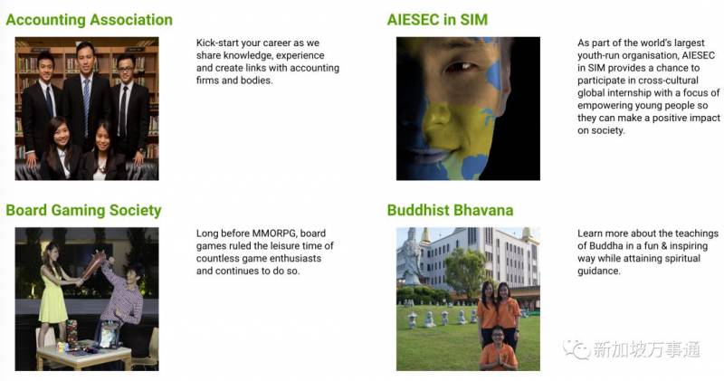 SIM的社团分为5大类---“艺术类”、“国际学生社团类”、“能力发展类”、“兴趣爱好类”、“体育活动类”。这5个分类下的社团,林林总总近百个。