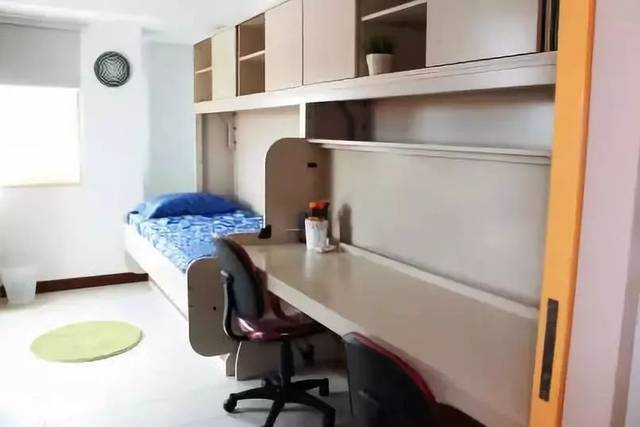 每一名学生有一张睡床、书架、储藏柜子、书桌、椅子、衣橱、抽屉以及延长电线。良好的环境,让不能陪读的家长也能放心孩子在这学习。