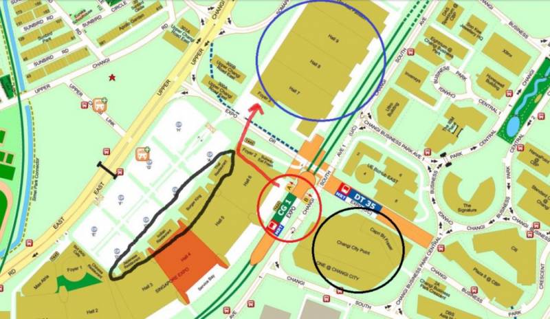 红色圆圈代表的就是博览中心地铁站(Expo MRT Station CG1),也就是考场那一站;