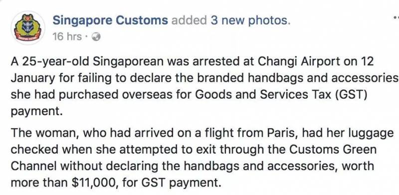 翻译:1月12日,一名25岁新加坡人在樟宜机场被捕,原因是她未向海关申报在海外购买的免税品牌手袋和配饰。这名女子从巴黎飞抵新加坡,在通过新加坡海关是走的是“无申报”绿色通道,海关拦下她进行检查,发现实际上她所持的物品已超过11,000新元。