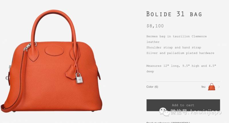 爱马仕经典款Bolide包包,价值8100美元,折合11029新币。